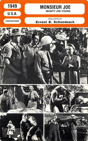 This film was first called Mr. Joseph Young of Africa, then The Great Joe Young. Before its release, Merian Cooper had already announced a sequel, Joe Meets Tarzan, but the film was such a financial failure that the sequel was cancelled. It had cost almost two million dollars. However, it won Willis O’Brien the only Oscar of his career for the special effects. Mr. Joe likewise marked the the first work on a commercial feature by Ray Harryhausen (who was called “The Man Who Saw King Kong 90 times”), a great admirer of Willis O’Brien who became his sucessor and great disciple. Through his special effects work on numerous fantasy films, Ray Harryhausen in his own right would become a popular celebrity. Among the films worth remembering: Eugene Lourie’s The Beast from 20,000 Fathoms (1953), Irwin Allen’s The Animal World (1956), Nathan Juran’s The Seventh Voyage of Sinbad (1957), Cy Endfield’s Mysterious Island (1960), and Don Chaffey’s Jason and the Argonauts (1963). The character of the giant gorilla was created by means of six models of different sizes (from 12.5 to 45 centimeters) constructed by Roger Delgado [sic: correct first name is Marcel]. Each one consisted of 150 moving pieces and a fur covering made from the skins of stillborn lambs.