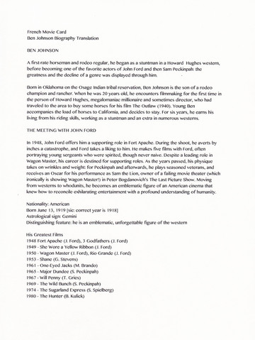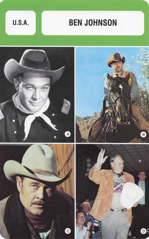American actor born June 13, 1981 in Foraker (Oklahoma). An authentic cowboy, Ben Johnson was hired in 1940 by Howard Hughes to bring a herd of horses to California. As a newcomer in Hollywood, he worked on a number of westerns as a stuntman, eventually doubling stars like Gary Cooper, James Stewart and John Wayne. His opportunity came when John Ford gave him supporting roles in Three Godfathers and She Wore a Yellow Ribbon, before making him the lead in Wagon Master. He left the movies for a time in order to earn a rodeo championship, but films paid better (and were less dangerous), and he returned after two years away. He worked mainly in westerns during his life, and became one of Sam Peckinpah's favorite actors, appearing in four of his films, as well as westerns directed by Andrew McLaglen and Tom Gries. But it was his performance in The Last Picture Show that would win him an Oscar. He died from a heart attack on April 8, 1996 in Mesa (Arizona).